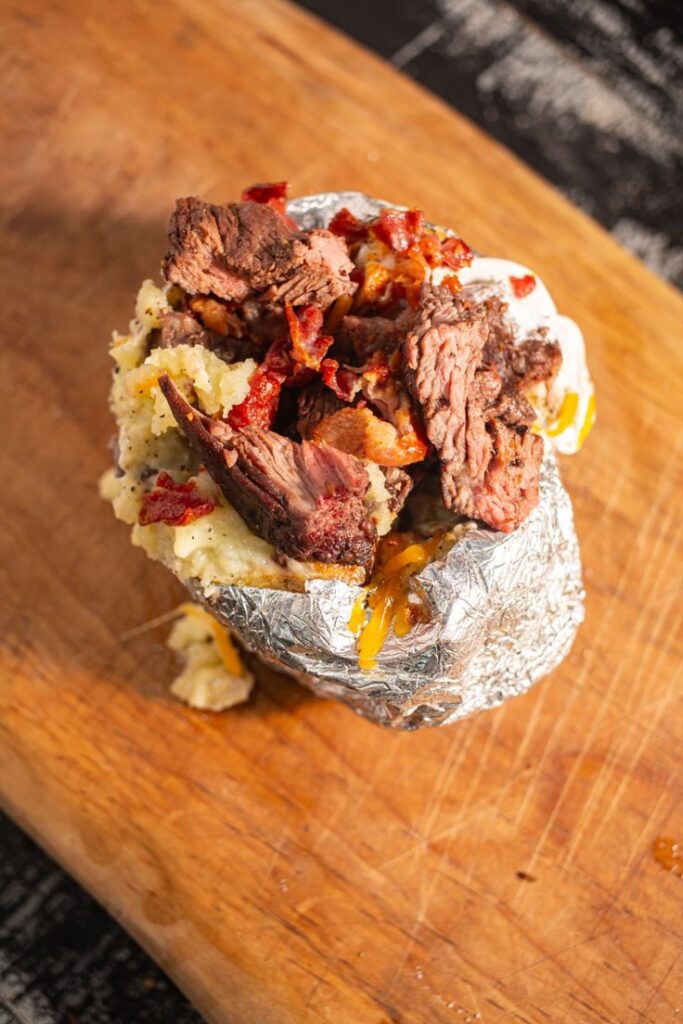 Papa asada rellena de jugosa carne, queso derretido.
